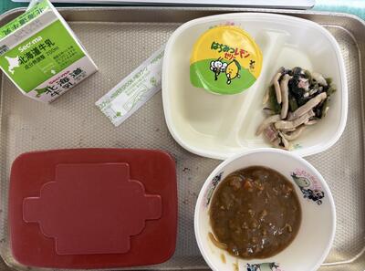 チキンカレー★牛乳★エリンギとベーコンのソテー★牛乳はちみつレモンゼリー